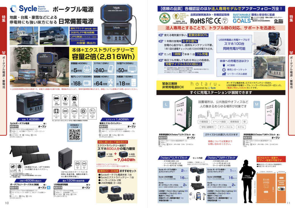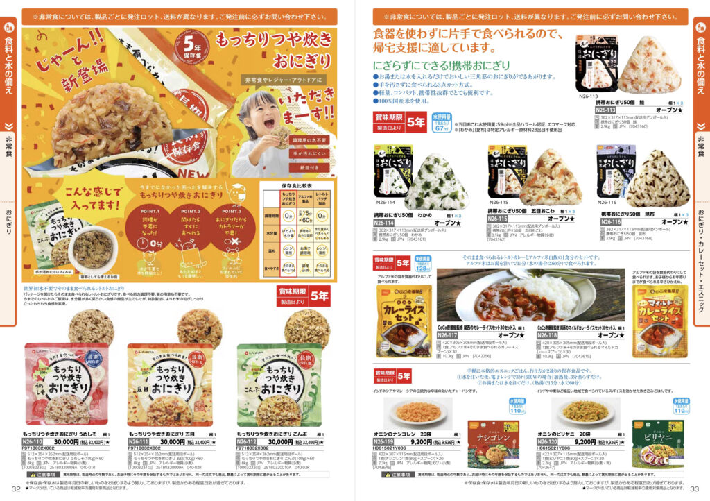 本カタログでは様々な災害を想定し、オフィス・自宅・避難施設などの利用シーンに応じて、シェアできる防災セットや備蓄スタンド、車載用防災セット、椅子取り付け型防災バッグなど、いざというときに役立つ防災用品を厳選して掲載しています。
